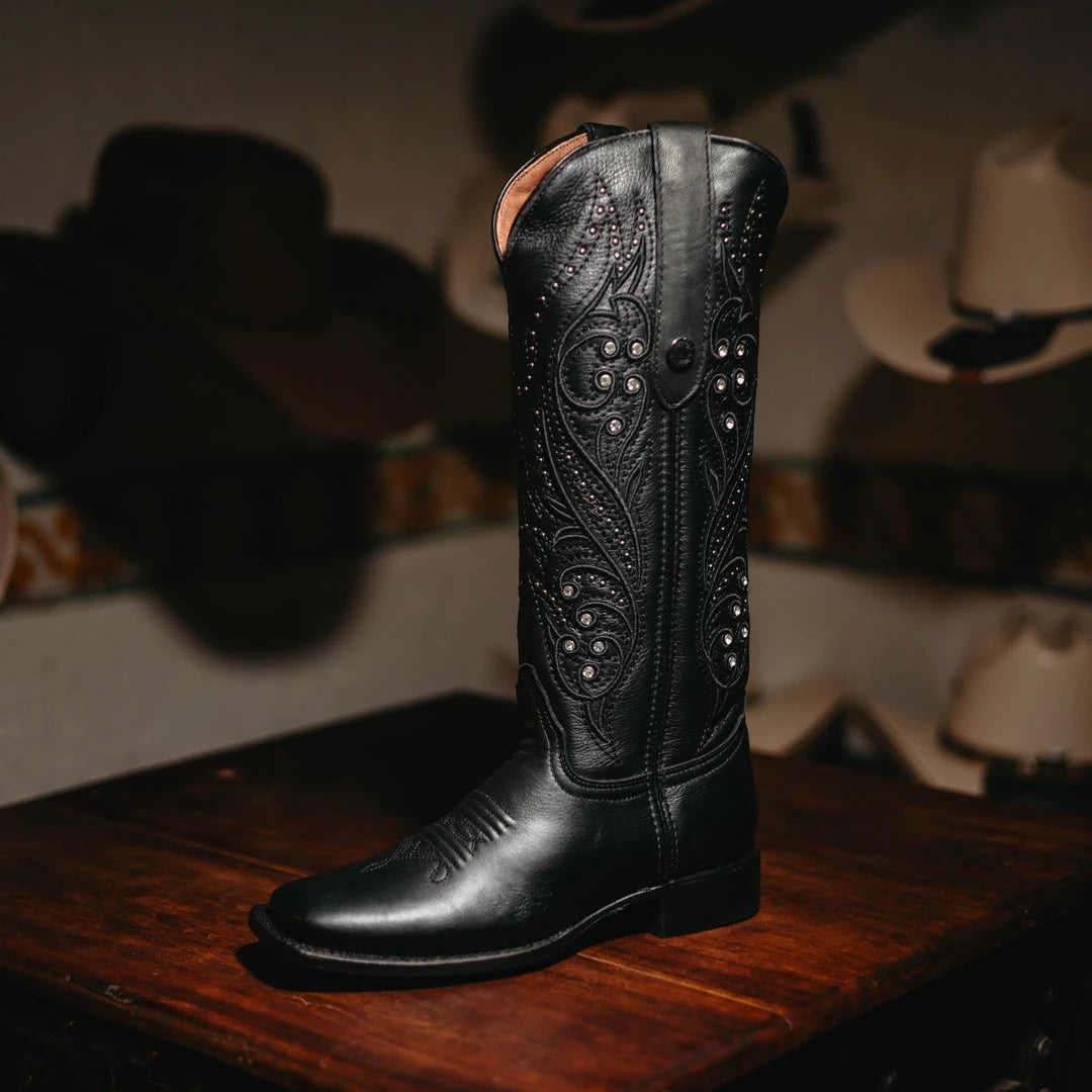 Bota Vaquera Athiri, Piel Vacuno, Forro Vacuno, Modelo Rihanna, Color Negro, Horma-057, Tubo con aplicación de Estoperoles y Cristales, Suela de Cuero, Construcción Goodyear Welt, Altura Tubo: 31 cm, Altura tacon: 2.5 cm (medidas aproximadas), SKU# ATH2002