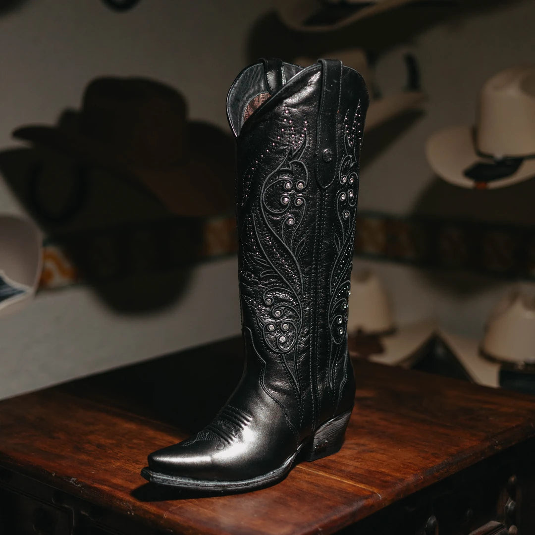 Bota Vaquera Athiri, Piel Vacuno, Forro Vacuno, Modelo Rihanna, Color Gris Metálico, Horma-Marie Retro, Tubo con Aplicación de Estoperoles y Cristales, Suela de Cuero, Construcción Goodyear Welt, Altura Tubo: 32 cm, Altura tacon: 4.5 cm (medidas aproximadas), SKU# ATH2007, Nota: Esta Horma viene amplia le sugerimos ordenar medio numero menos, cualquier duda favor de comunicarse con nosotros con gusto le asesoraremos.