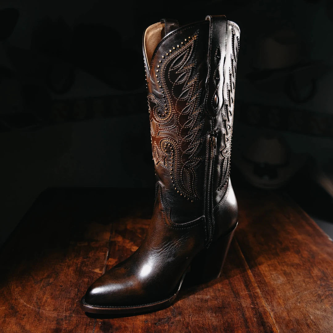 Bota Rio Grande, Piel Vacuno, Forro Vacuno, Modelo Arabela, Color Cafe, Horma Oval, Con aplicacion de Estoperoles en el tubo y Zipper lateral, Plantilla Gran Confort Durabilidad 24/7, Suela cuero, Altura del Tubo: 24cm, Altura tacon: 7.5cm (medidas aproximadas), SKU# RIO2026