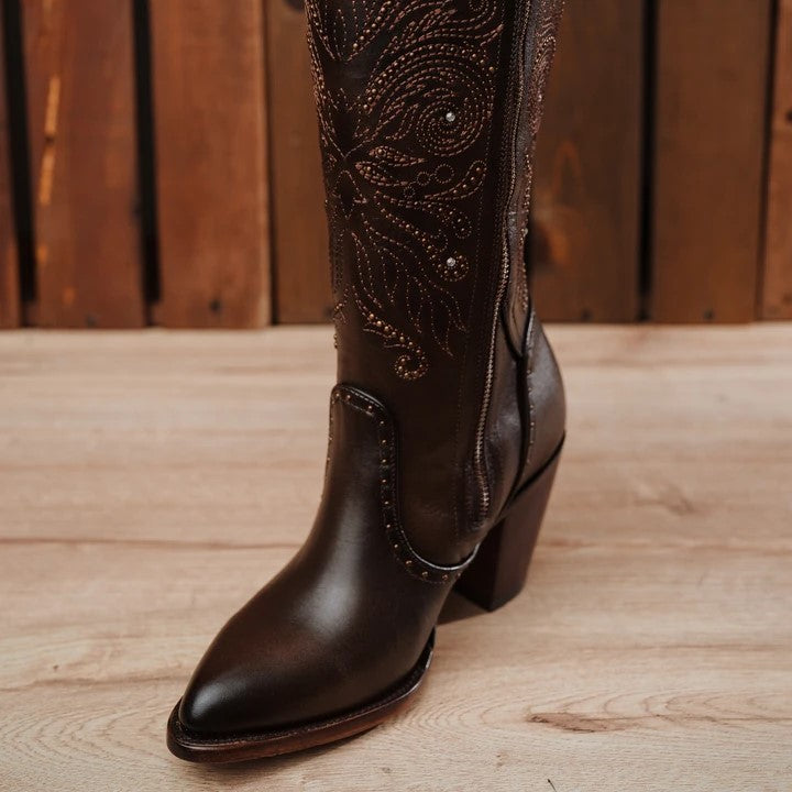 Bota Rio Grande, Piel Vacuno, Forro Vacuno, Horma-Oval, Zipper lateral, Aplicacion de Estoperoles remachados, Plantilla Gran Confort, Suela de Vaqueta de Alta Durabilidad y Tapa de Hule en tacon para Mayor Tracción, Altura del Tubo: 28cm, Altura tacon: 8cm (medidas aproximadas), SKU# RIO2021