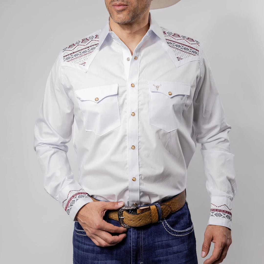 Camisa Cactus, Bordada, Color Blanca, Manga Larga, Broches de presion, Material 100% Algodón, Corte Regular, SKU# CAC1125 *Modelo Mide 1.80, pecho 1.12 mts y uso talla M