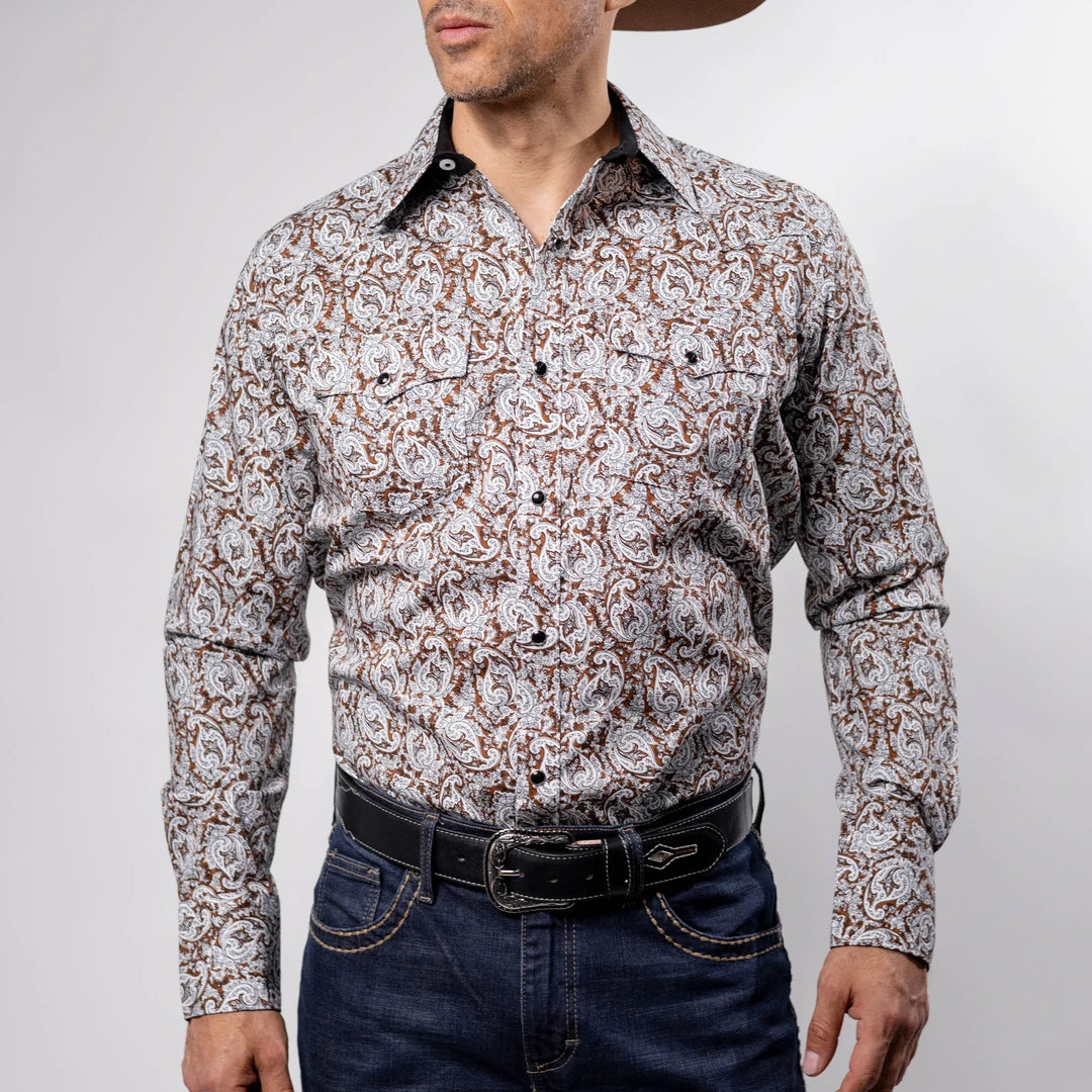 Camisa Cactus, Estampada Amibas, Color Cafe, Manga Larga, Broches de presion, Material 100% Algodón, Corte Regular, SKU# CAC1128 *Modelo Mide 1.80, pecho 1.12 mts y uso talla M