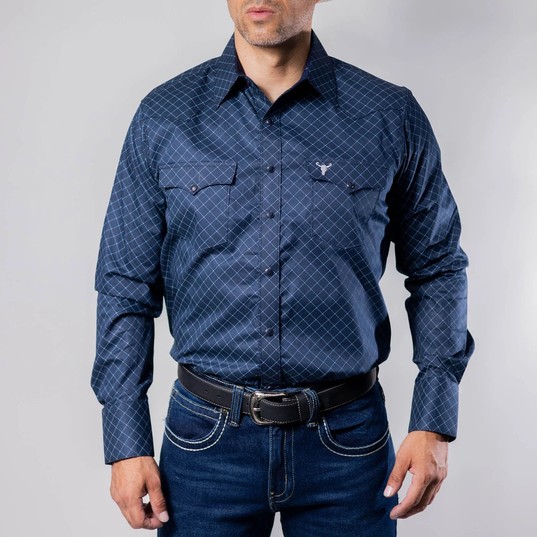 Camisa Vaquera Cactus, Estampado Color Azul Marino, Manga Larga, Broches de presión, Stretch, Material 100% Algodón, Corte Regular, SKU# CAC1134 *Modelo Mide 1.80, pecho 1.12 mts y usó talla M