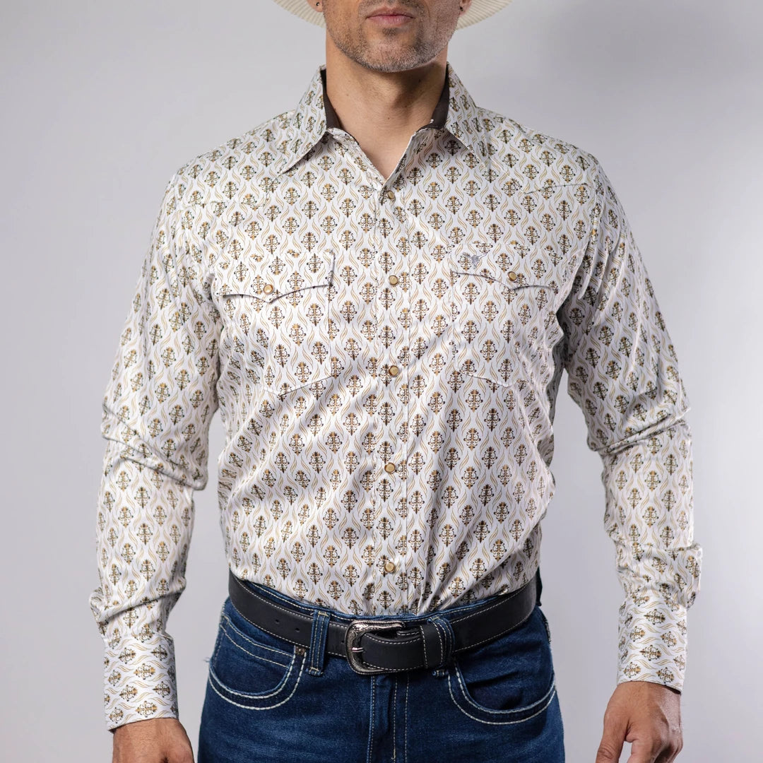 Camisa Vaquera Cactus, Estampado, Color Blanco/Dorado, Manga Larga, Broches de presión, Material 90% Poliester y 10% Algodón, Corte Regular, SKU# CAC1142 *Modelo Mide 1.80, pecho 1.12 mts y usó talla M