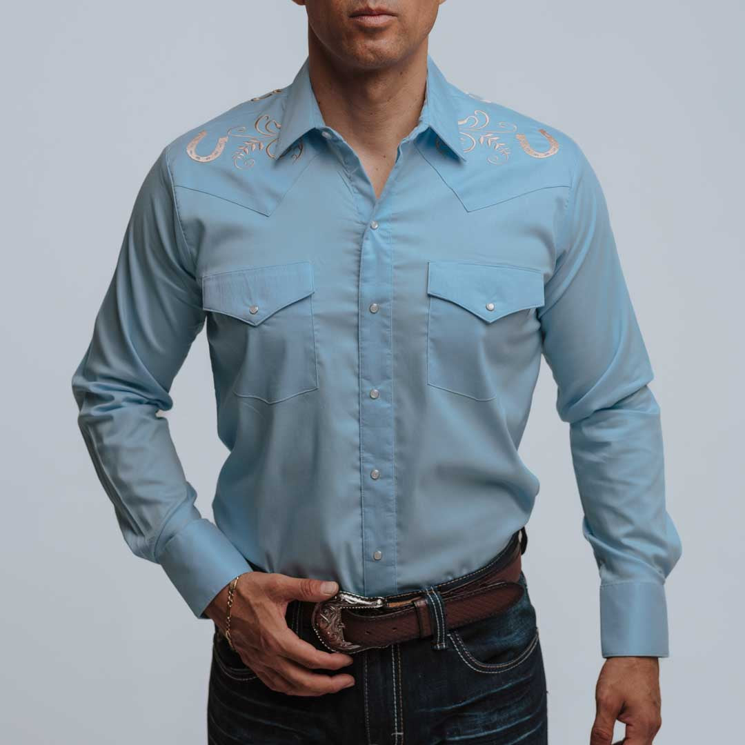 Camisa Hannover, Manga Larga, Estilo: Bordada, Stretch, Herradura, Broches de presión, 65% Poliéster 35% Algodón, Corte Regular, SKU# HAN1210, *Modelo Mide 1.80, Pecho 102cm y uso talla S