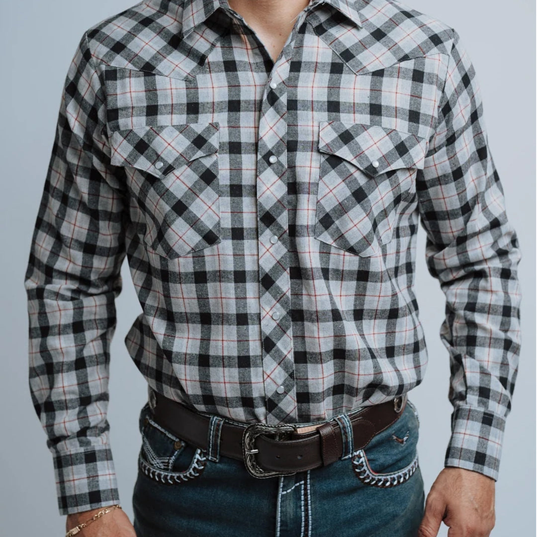 Camisa Hannover, Cuadros Franela, Color Gris/Negro, Manga Larga, Broches de presión, Materiales 65% Poliéster y 35% Algodón, Corte Regular, SKU# HAN1360, *Nota: Las Camisas Hannover para caballero tienen corte amplio, le sugerimos revisar la tabla de medidas o llamarnos para cualquier duda, *Modelo Mide 1.80, pecho 1.12 mts y uso talla M