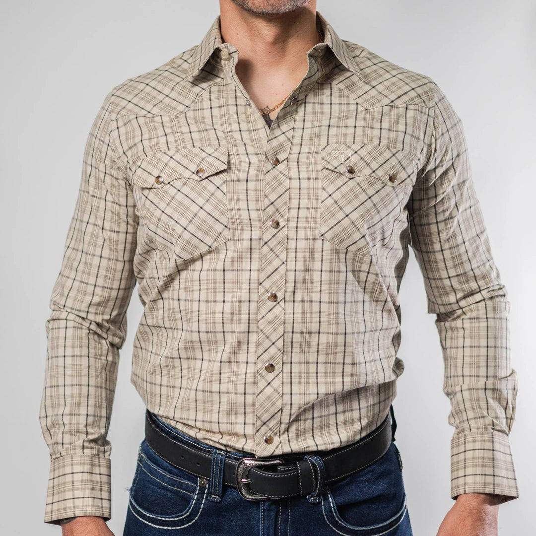 Camisa Vaquera Platini, Cuadros, Color Khaki, Broches de presion, Manga Larga, Material 100% Algodon, Corte Regular, SKU# PLA1074 *Modelo Mide 1.80, pecho 1.12 mts y usó talla M