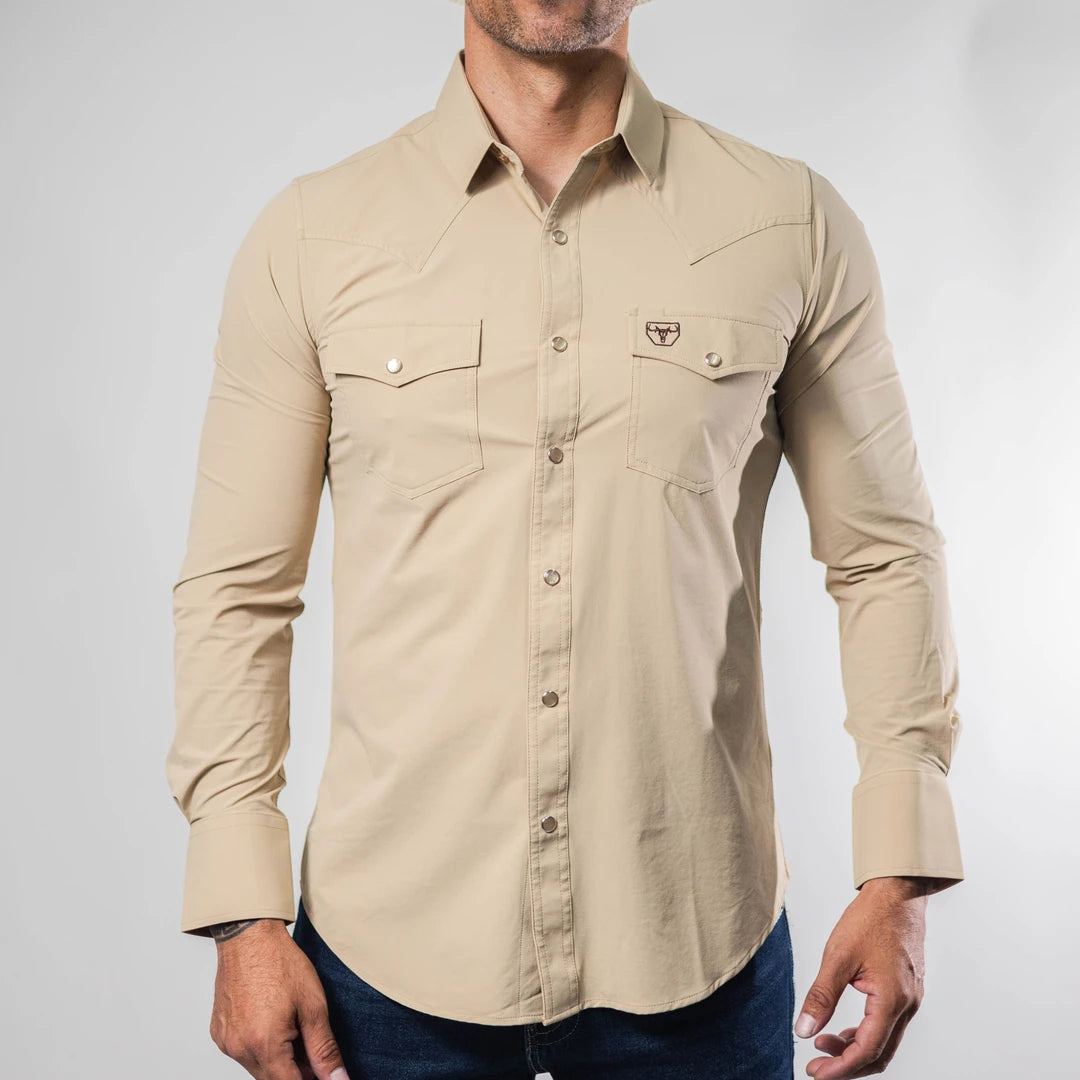 Camisa Vaquera Platini, Lisa, Color Beige, Ligera, Broches de presion, Manga Larga, Stretch, Material 90% Nylon y 10% Spandex, Corte Regular, SKU# PLA1071 *Modelo Mide 1.80, pecho 1.12 mts y usó talla M