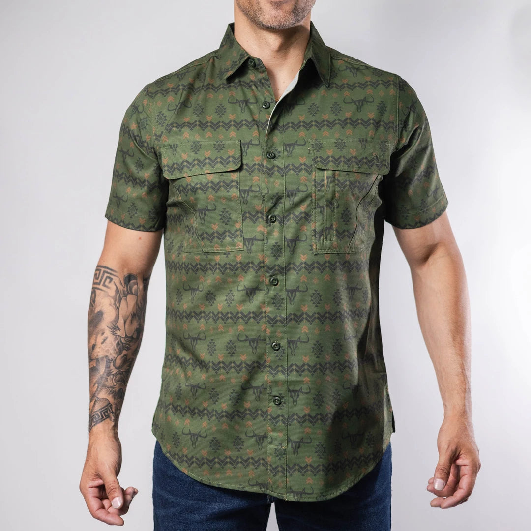 Camisa Platini, Estilo Pescador, Estampado, Color Olivo, Performance Ligera y Transpirable, Control de Olores, Absorcion y Sistema...