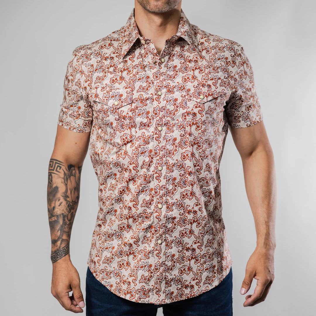 Camisa Vaquera Rock&Roll, Color Beige, Estampado Amibas, Manga Larga, Broches de presión, Bolsas con broches en el pecho, Stretch, Material 97% Cotton y 3% Spandex, SKU# ROC1062, *Modelo Mide 1.80, pecho 1.12 mts y uso talla M
