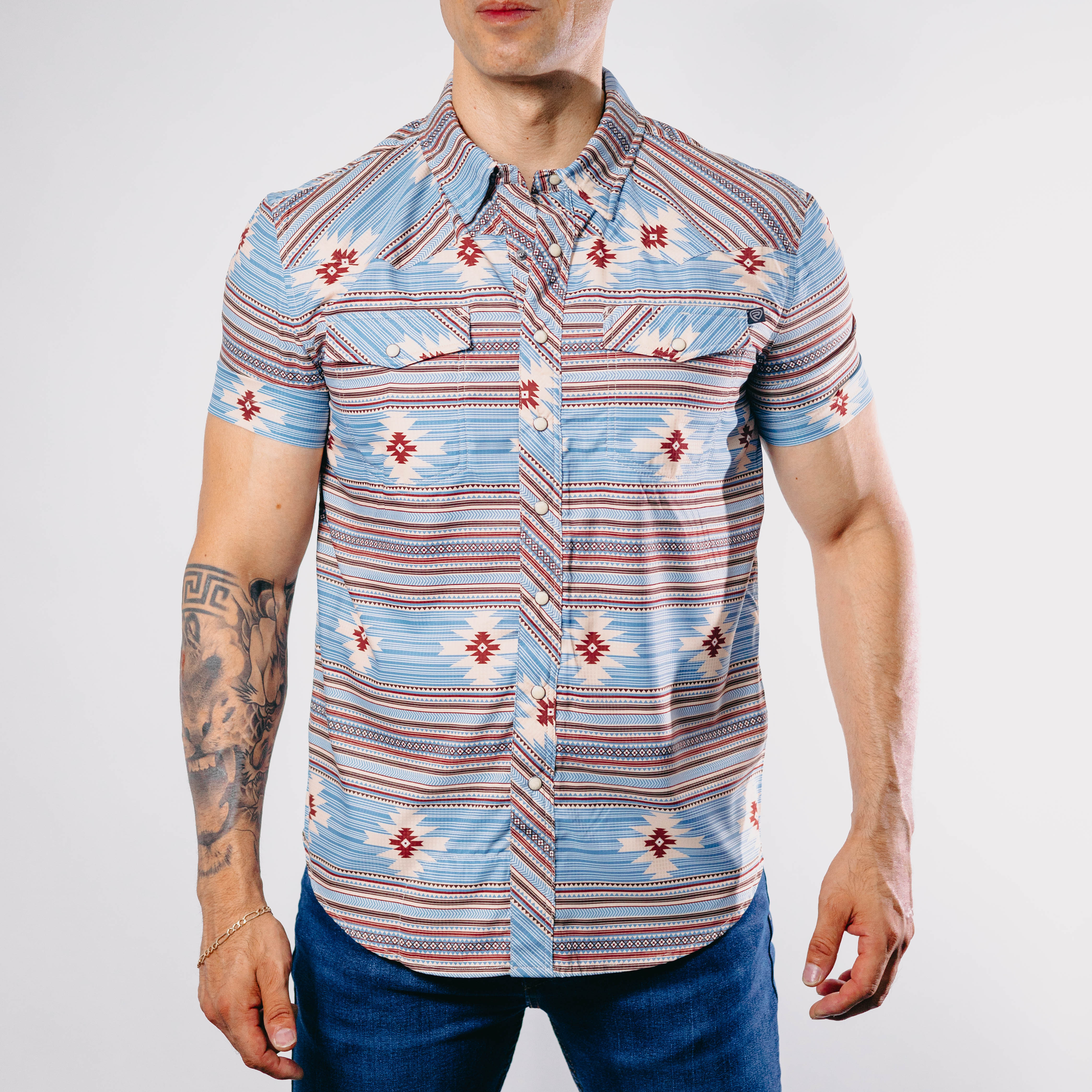 Camisa Vaquera Rock&Roll, Performance Ligera y Transpirable, Control de Olores, Absorcion y Sistema de Ventilacion Trasera, Aztec Azul, Manga Corta, Broches de presón, Corte Regular, 100% Poliester, SKU# ROC1016, *Modelo Mide 1.80, pecho 1.12 mts y uso talla M