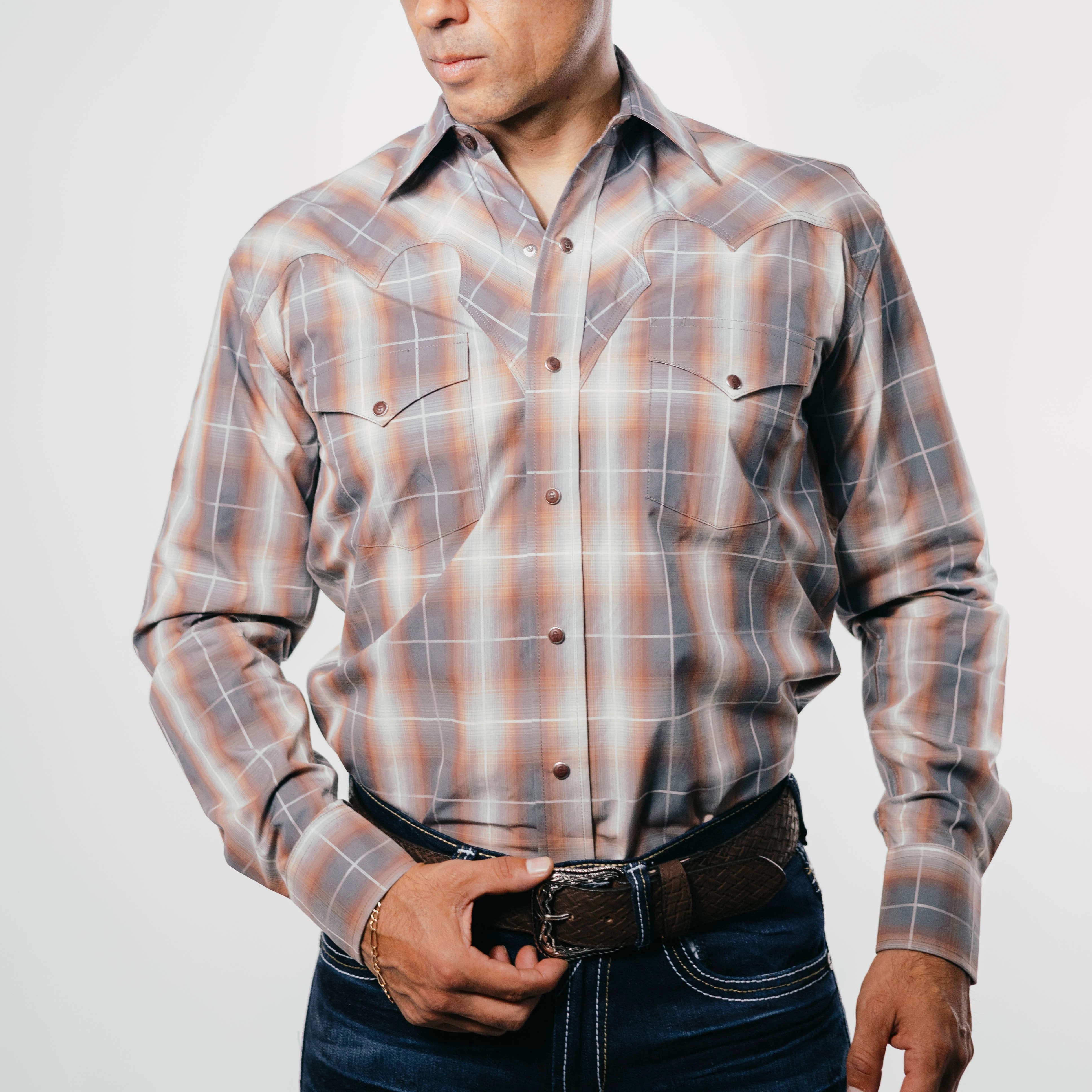 Legendaria Marca Steson, Camisa Vaquera, Cuadros, Color Naranja/Gris, Manga Larga, Broches de presión, Material 100% Algodon, Corte Regular USA, SKU# STE1102, *Nota: Las Camisas Stetson para caballero tienen corte amplio, le sugerimos revisar la tabla de medidas o llamarnos para cualquier duda, *Modelo Mide 1.80, pecho 1.12 mts y uso talla S