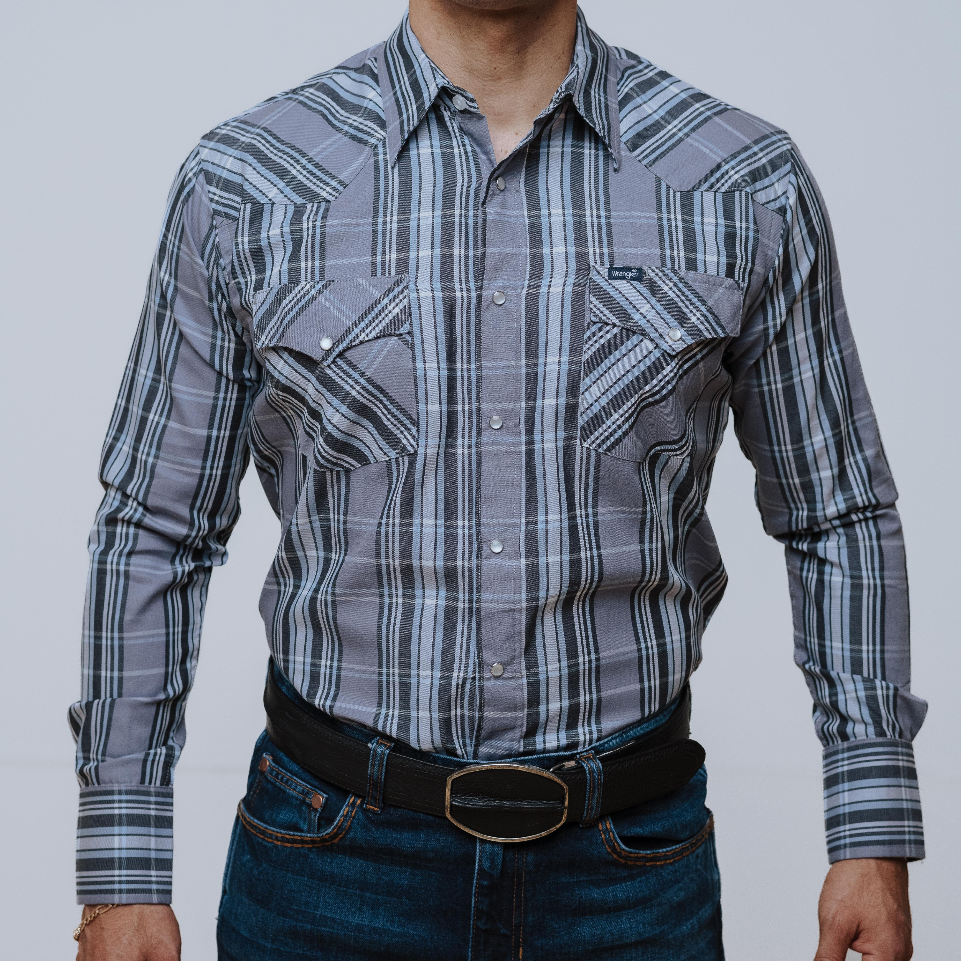 Camisa Vaquera Wrangler, Cuadros, Gris, Rayas, Manga Larga, Broches de presión, 100% Algodón, Corte Regular, SKU# WR21190, *Modelo Mide 1.80, pecho 1.12 mts y uso talla M