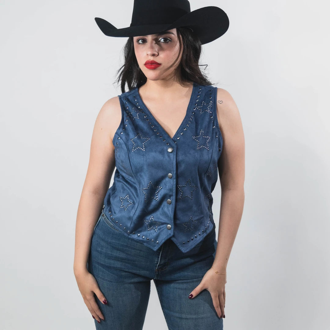 Chaleco Rock&Roll, Gamucina Color Azul, Aplicación de Estoperoles en forma de Estrellas, Broches de presión, Stretch, Corte...