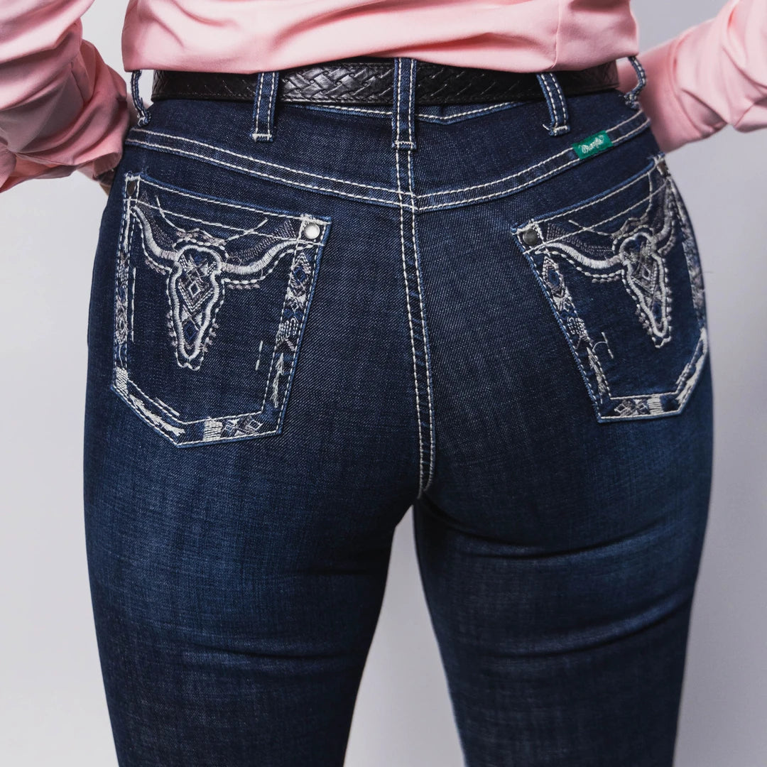 Pantalon Vaquero Wrangler, Cintura Alta (High Rise), Corte de bota, Botón y Cierre Con Cremallera Metálica al Frente, Bordados Toritos en Bolsillos, Stretch, Material 71% Algodón, 27% Polirester y 2% Elastano, SKU# WR32081