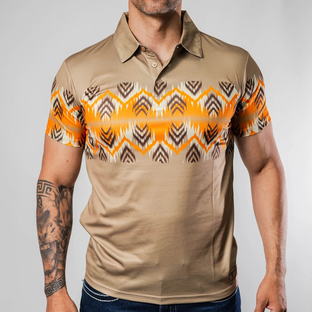 Playera Tipo Polo Platini, Ligera y Transpirable, Control de Olores y Absorcion, Estampado, Color Khaki/Naranja, Botones, Manga Corta, Stretch, Material 100% Poliester, Corte Fit, SKU# PLA1081, *Modelo Mide 1.80, pecho 1.12 mts y usó talla M