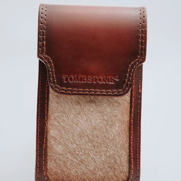 Porta Celular Tombstone, Grabado, Pelo, Costuras, Color Cafe, 100% Piel Vacuno, Forro Vacuno, Largo: 18cm, Ancho: 9.5cm, SKU# TOM6001041, *Nota.- Medidas aproximadas