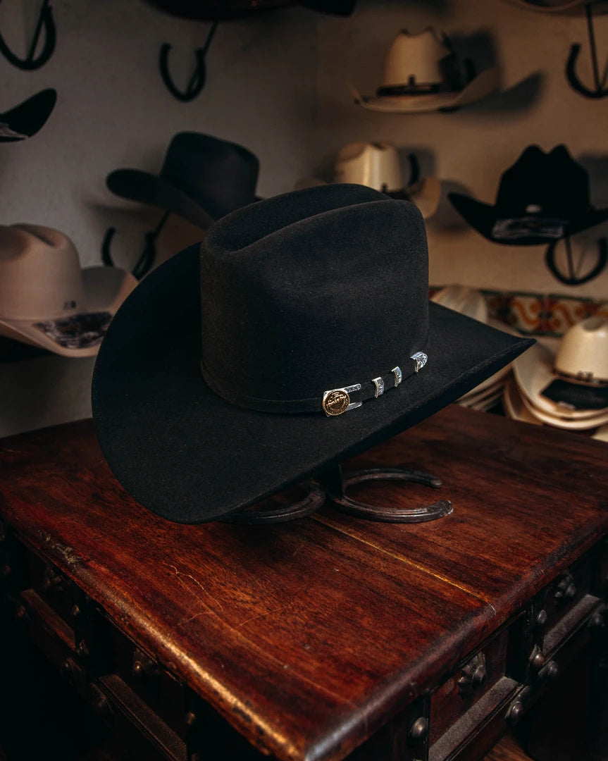 Texana Tombstone, 1000X, Pelo Nutria, Horma-El Patron, Color Negro, Toquilla al Tono con Herraje Color Plata y Oro, Falda 10 cm, Copa 12 cm, SKU# TOM1115 *Nota.- Medidas Aproximadas