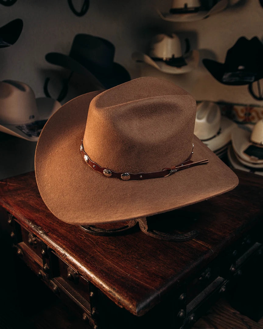 Texana Tombstone, Lana, Horma-Denver, Color Nuez, Calidad 20 Estrellas, Toquilla sintetica con Aplicacion de Chapetones , Falda 9.5 cm, Copa 10 cm, SKU# TOM1112 *Nota.- Medidas Aproximadas