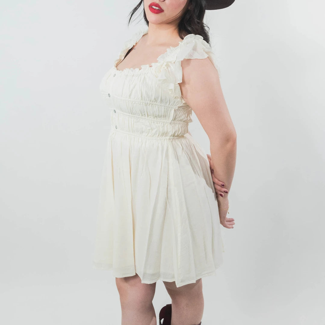 Vestido Rock&Roll, Liso, Color Blanco, Resorte en cintura, Botones decorativos al frente, Material 50% Algodón y 50% Rayon, SKU# ROC2019, *Modelo Mide 1.56, pecho 92 cm y uso talla M
