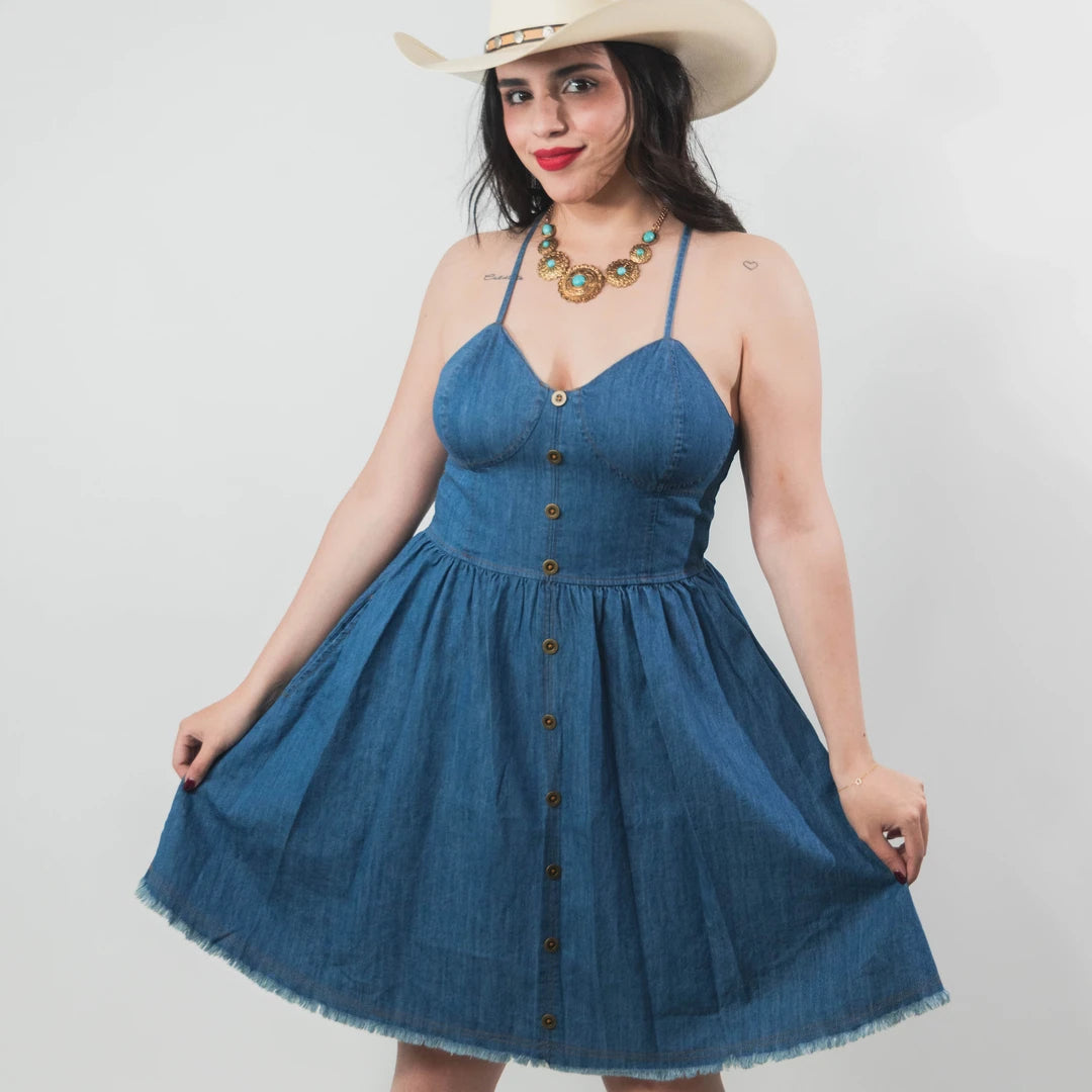Vestido Rock&Roll, Liso, Mezclilla Azul, Zipper de metal trasero, Botones Decorativos al Frente, Material 100% Algodón, SKU# ROC2021, *Modelo Mide 1.56, pecho 92 cm y uso talla M