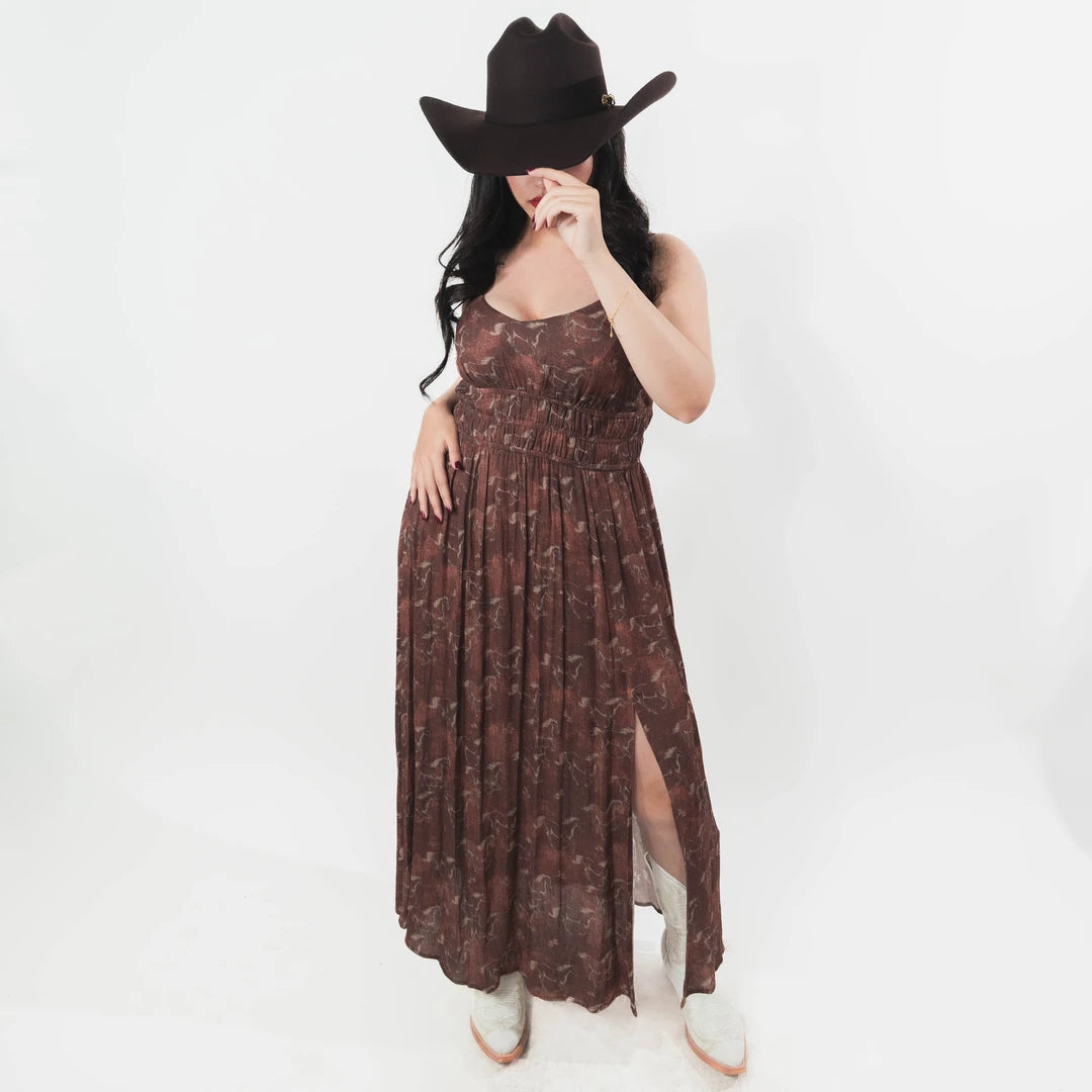 Vestido Vaquero Rock&Roll, Estampado Caballos, Color Cafe, Resorte en cintura, Abertura Lateral, Maxi Dress, Material 100% Rayon, SKU# ROC2020, *Modelo Mide 1.56, pecho 92 cm y uso talla M