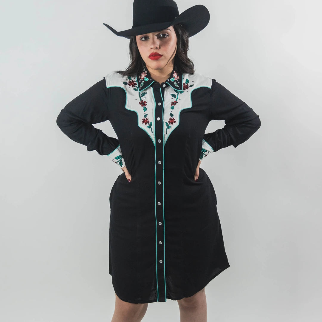 Vestido Vaquero Rock&Roll, Bordado frente y Espalda, Aplicación de Estoperoles, Color Negro, Bolsas Laterales, Manga Larga, Corte Regular, Broches de presión, Material 100% Rayon, SKU# ROC2011, *Modelo Mide 1.56, pecho 92 cm y uso talla M