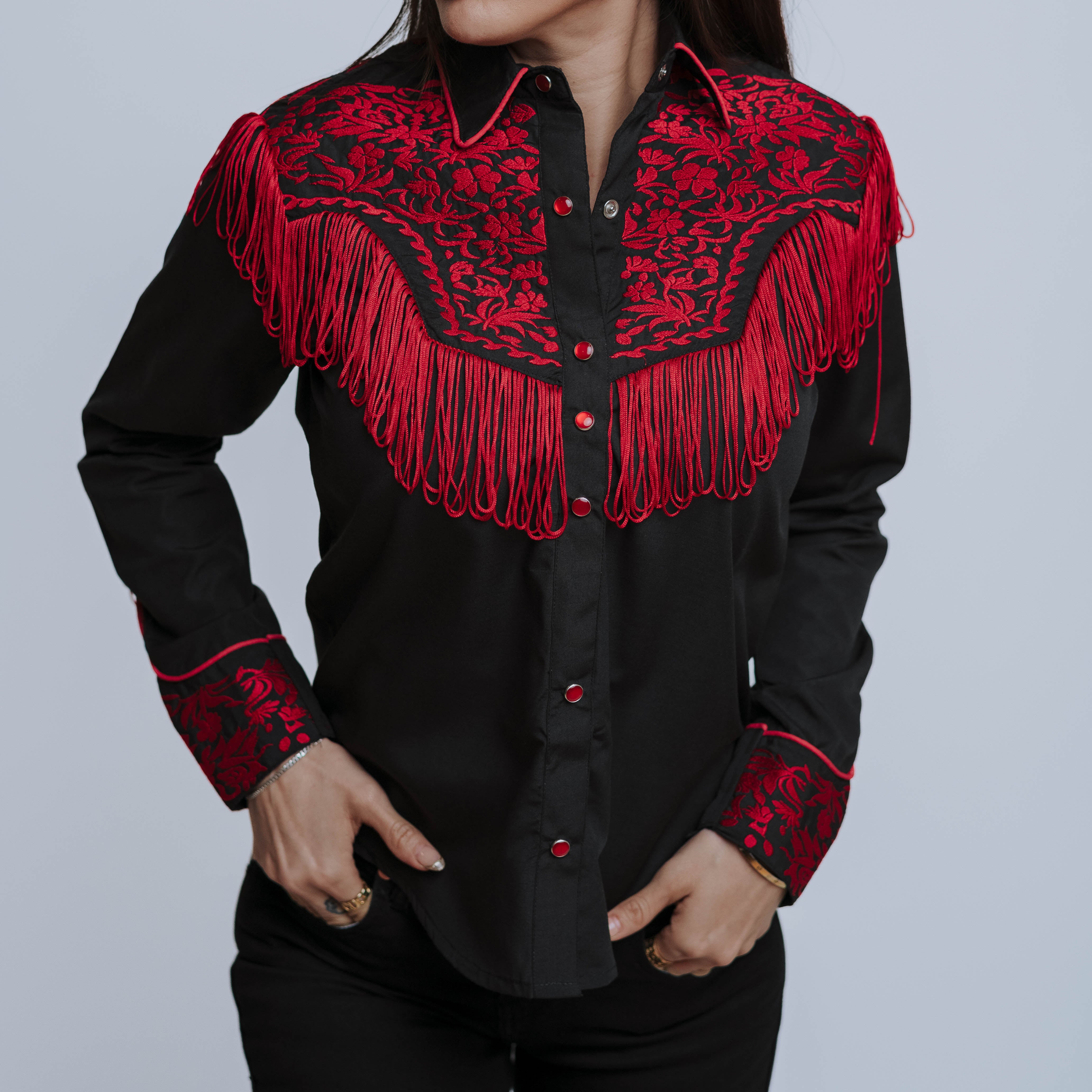 Blusa Vaquera American West, Bordada, Negra/Rojo, Flecos frente y atrás, Broches de presión, Manga Larga, 65% Poliester, 35% Algodón, Corte Regular, SKU# AMW2006, *Modelo Mide 1.67, pecho 88cms y uso talla S