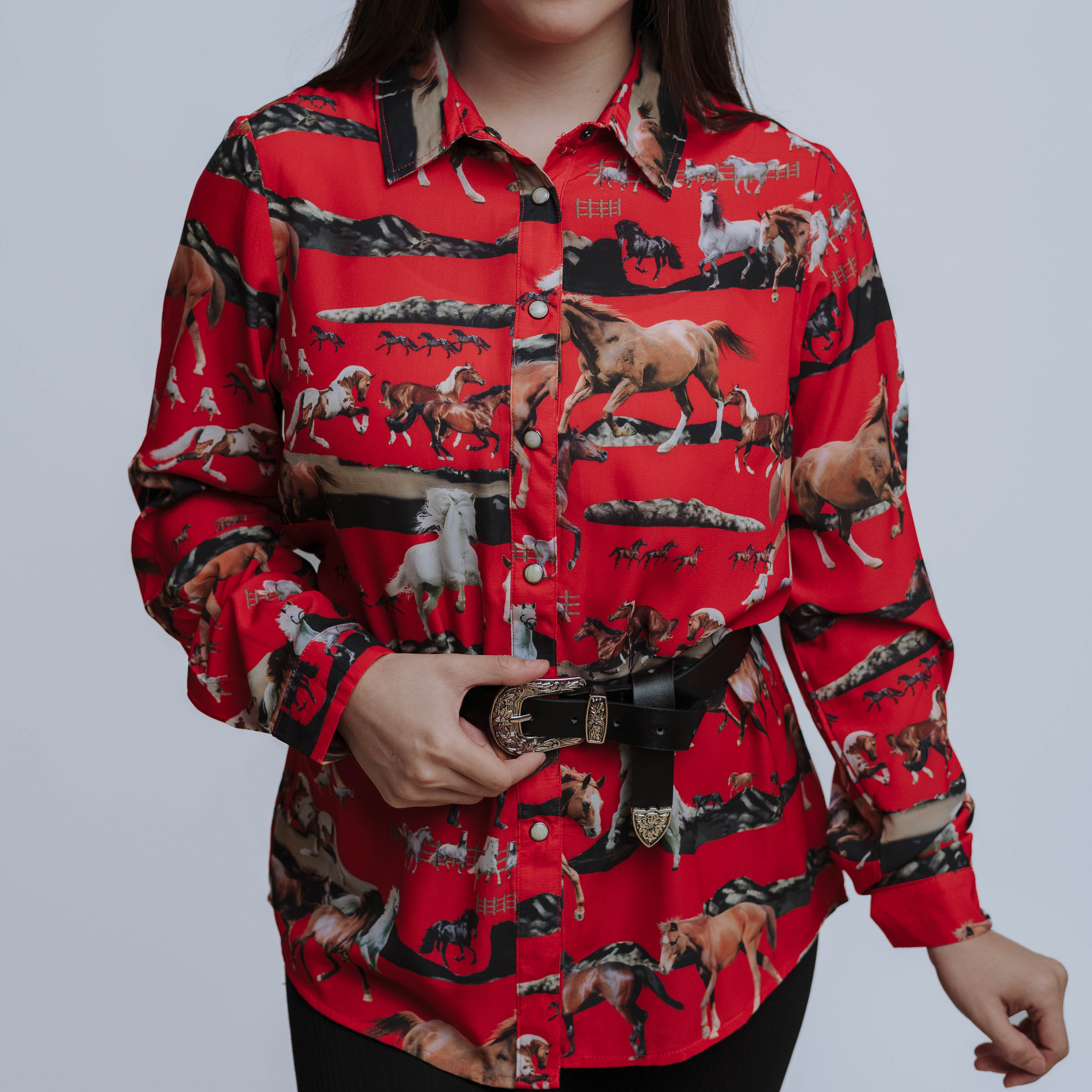 Blusa Fashion Express, Estampado Caballos, Roja, Broches de presión, Manga Larga, 100% Poliester, Corte Regular, SKU# FAE2002, *Modelo Mide 1.55, pecho 87cms y usó talla S ( *** No Incluye el cinto ***)