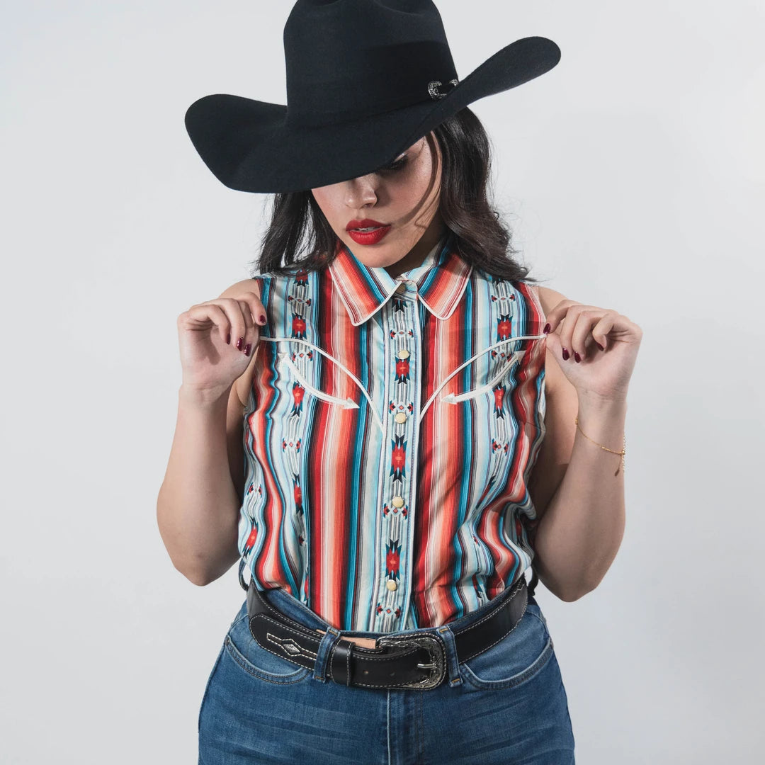 Blusa Vaquera Sin mangas Rock&Roll, Estampado Navajo Retro, Color Turquesa/Rojo, Broches de presión, Stretch, Material 97% Algodón y 3% Spandex, SKU# ROC2022, *Modelo Mide 1.56, pecho 92 cm y uso talla M