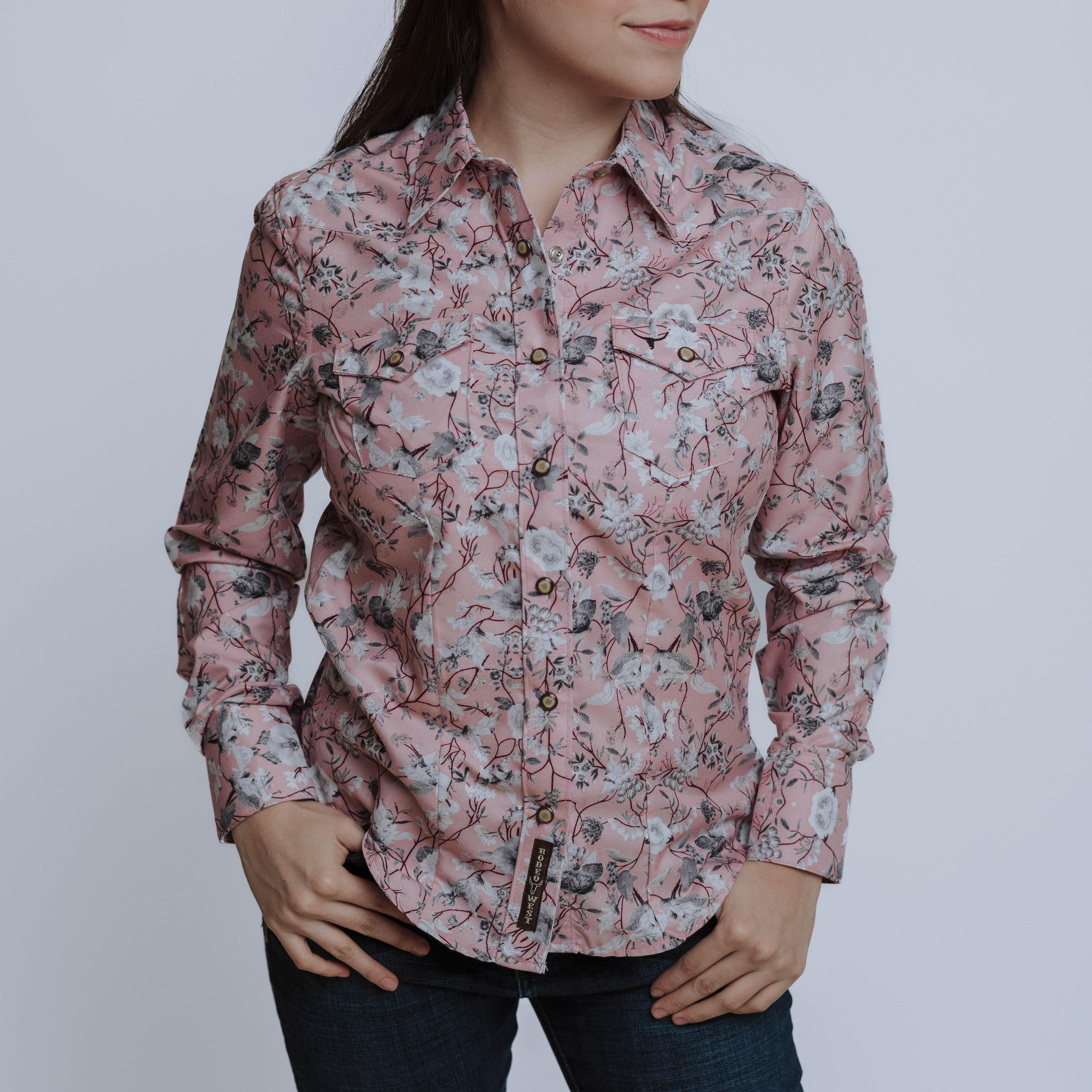 Blusa Vaquera Rodeo West, Estampado, Rosa/Flor, Broches de presión, Manga Larga, 100% Poliester, Corte Regular, SKU# ROD2010, *Modelo Mide 1.55, pecho 87cms y uso talla S