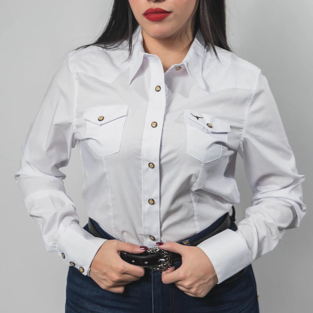 Blusa Vaquera Rodeo West, Color Blanca, Lisa, Material 100% Poliester, Manga Larga, Broches de presion, SKU#ROD2017, *Modelo Mide 1.56, pecho 92 cm y uso talla M