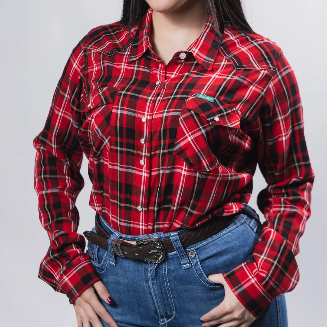 Blusa Vaquera Wrangler, Cuadros, Color Rojo/Negro, Broches de presión, Material 100% Viscosa, SKU# WR22070, *Modelo Mide 1.56, pecho 92 cm y uso talla M