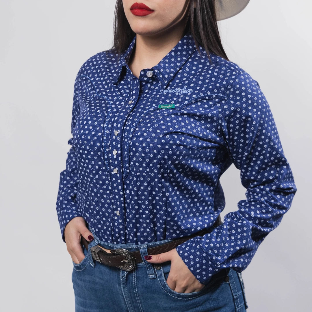 Blusa Vaquera Wrangler, Estampado Flor, Color Azul/Blanco, Broches de presión, Material 100% Algodón, SKU# WR22072, *Modelo Mide 1.56, pecho 92 cm y uso talla M