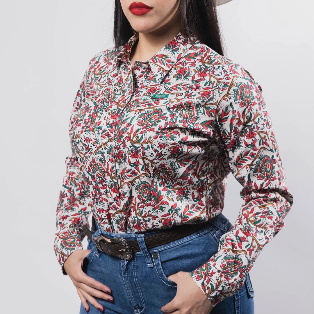 Blusa Vaquera Wrangler, Estampado Flor, Color Verde/Rojo, Broches de presión, Material 100% Algodón, SKU# WR22071, *Modelo Mide 1.56, pecho 92 cm y uso talla M