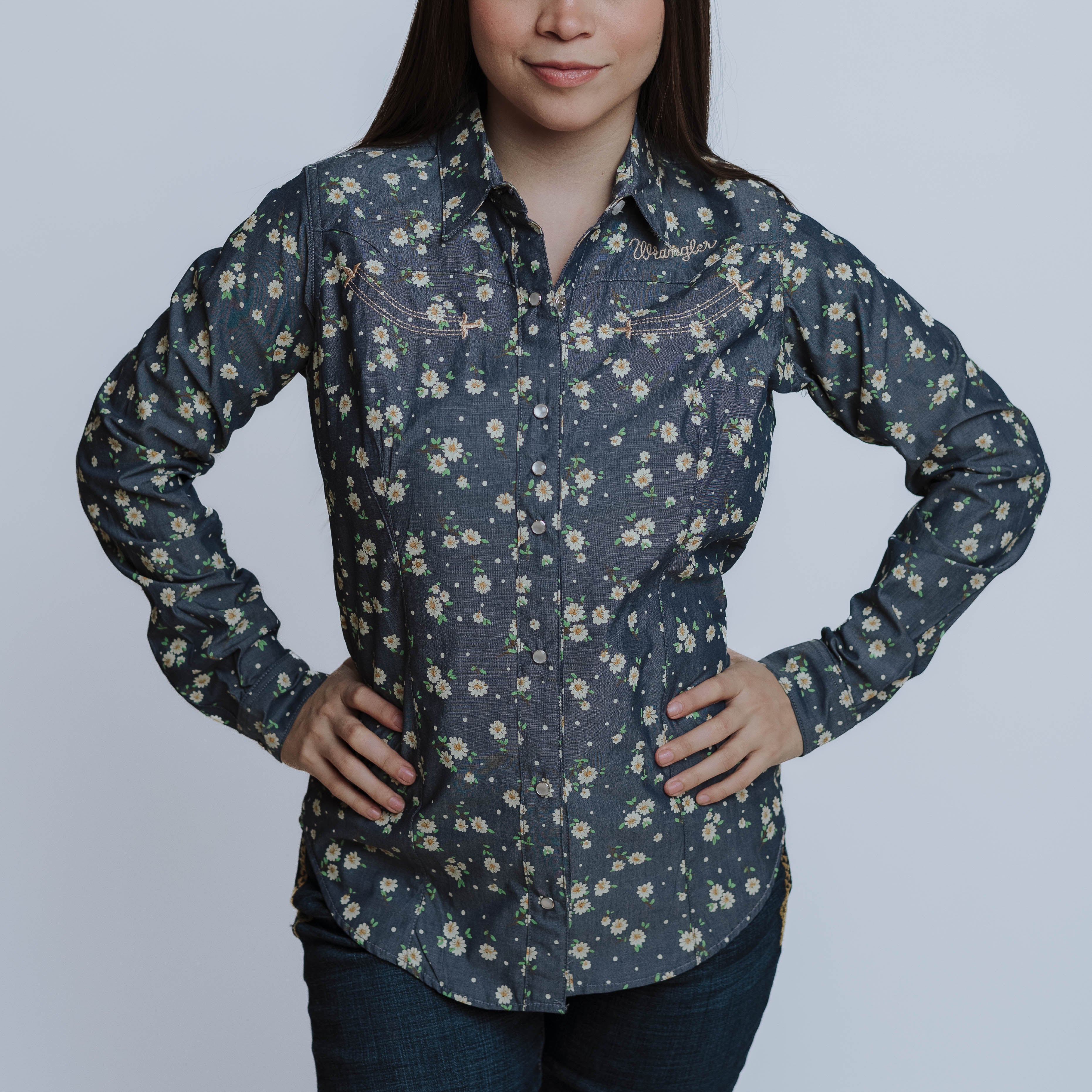 Blusa Wrangler, Estampado, Flores, Manga Larga, Broches de presion, 100% Algodón, SKU# WR22064, *Modelo Mide 1.55, pecho 87cms y uso talla S