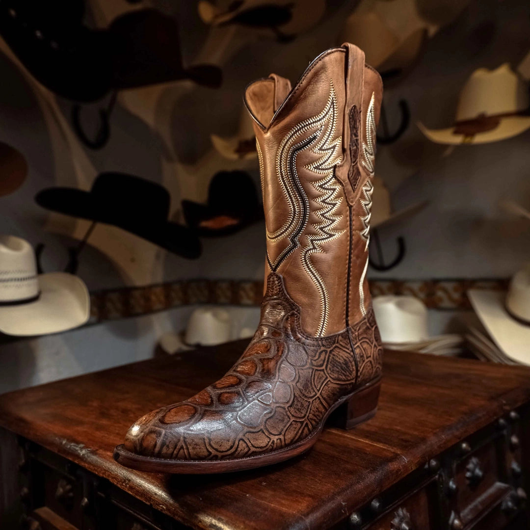 Bota Tejano Style, Piel Vacuno, Grabado Replica Caguama, Forro Vacuno, Horma-Oval, Color Old Cafe , Suela Cuero, Altura tubo: 32.5 cm, Altura tacon alto : 4 cm (medidas aproximadas), SKU# TEJ1064
