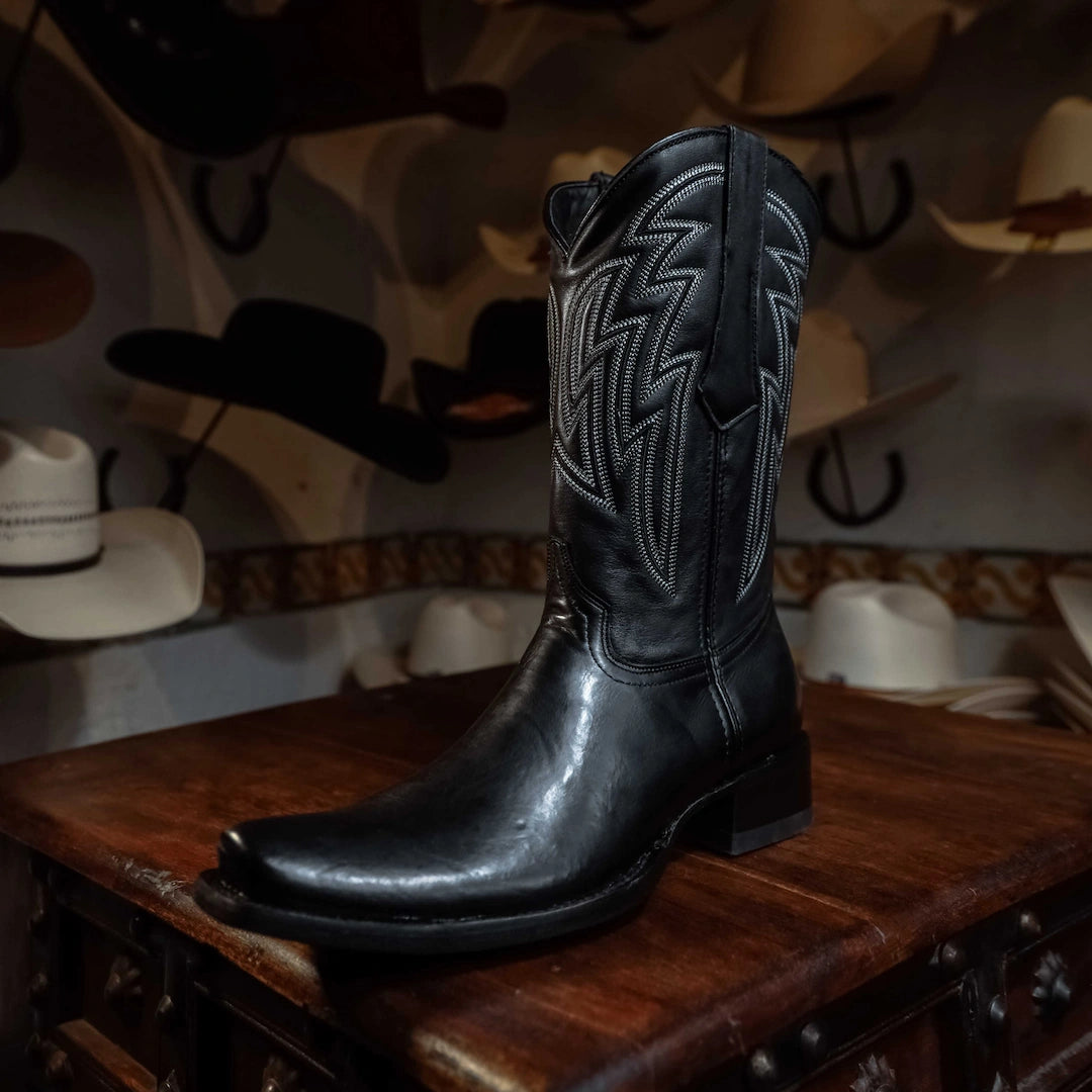 Bota Tejano Style, Fina Piel de Becerro, Forro Vacuno, Horma-Turin, Color Negro, Tubo Bordado, Suela Cuero, Altura tubo: 28.5 cm, Altura tacon alto: 3.5 cm (medidas aproximadas), SKU# TEJ1073