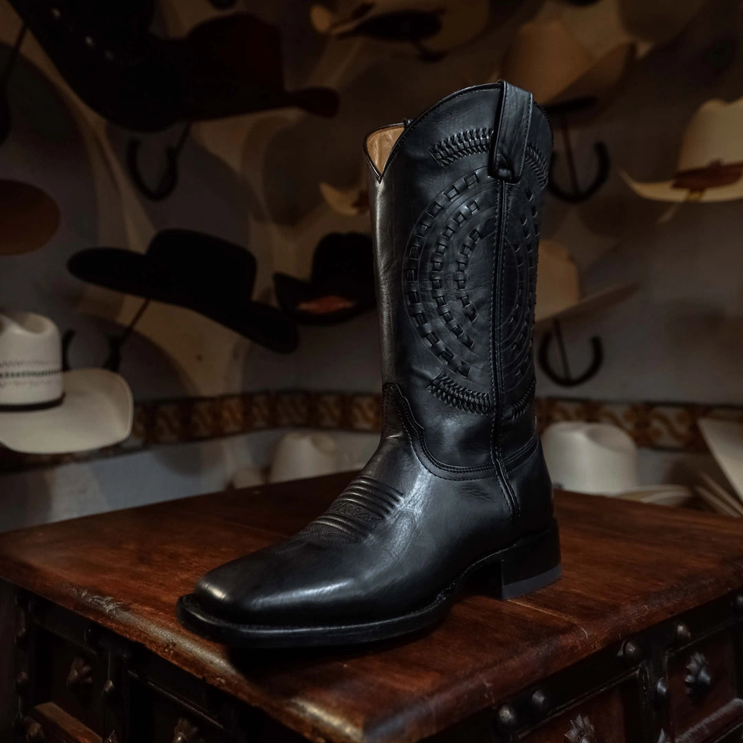 Bota Tejano Style, Fina Piel de Becerro, Forro Vacuno, Horma-501, Color Negro, Tubo en Piel de Becerro, Con Detalles de Tejido a Mano, Suela Cuero, Altura tubo: 32 cm, Altura tacon alto: 4 cm (medidas aproximadas), SKU# TEJ1072