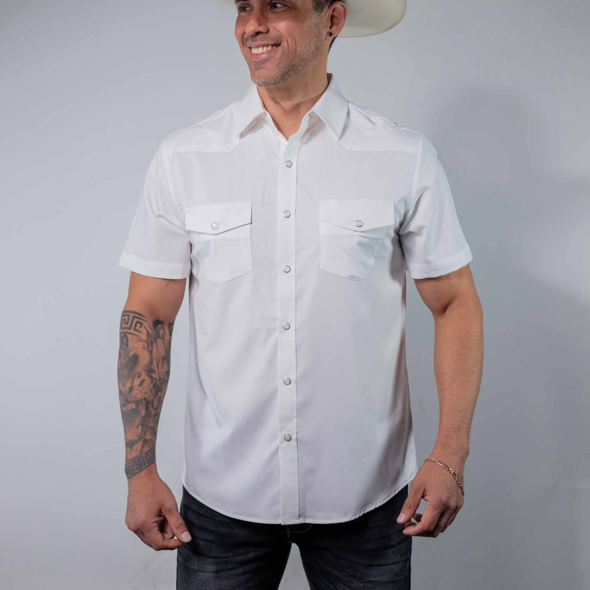 Camisa Vaquera McAllen, Performace, Estilo Pescador, Lisa, Color Blanco, Tela Ligera y Transpirable, Absorcion y sistema de Ventilación en Espalda, Manga Corta, Broches de presion, Stretch, Material 96% Algodón, 4% Spandex, Corte Regular, SKU# MC21075 *Modelo Mide 1.80, pecho 1.12 mts y uso talla M