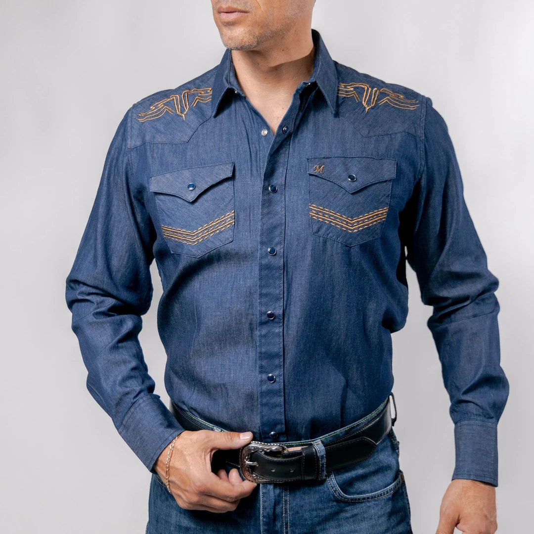 Camisa Vaquera 1800 West, Mezclilla, Bordado color Miel, Manga Larga, Broches de presión, Material 100% Algodón, Corte...