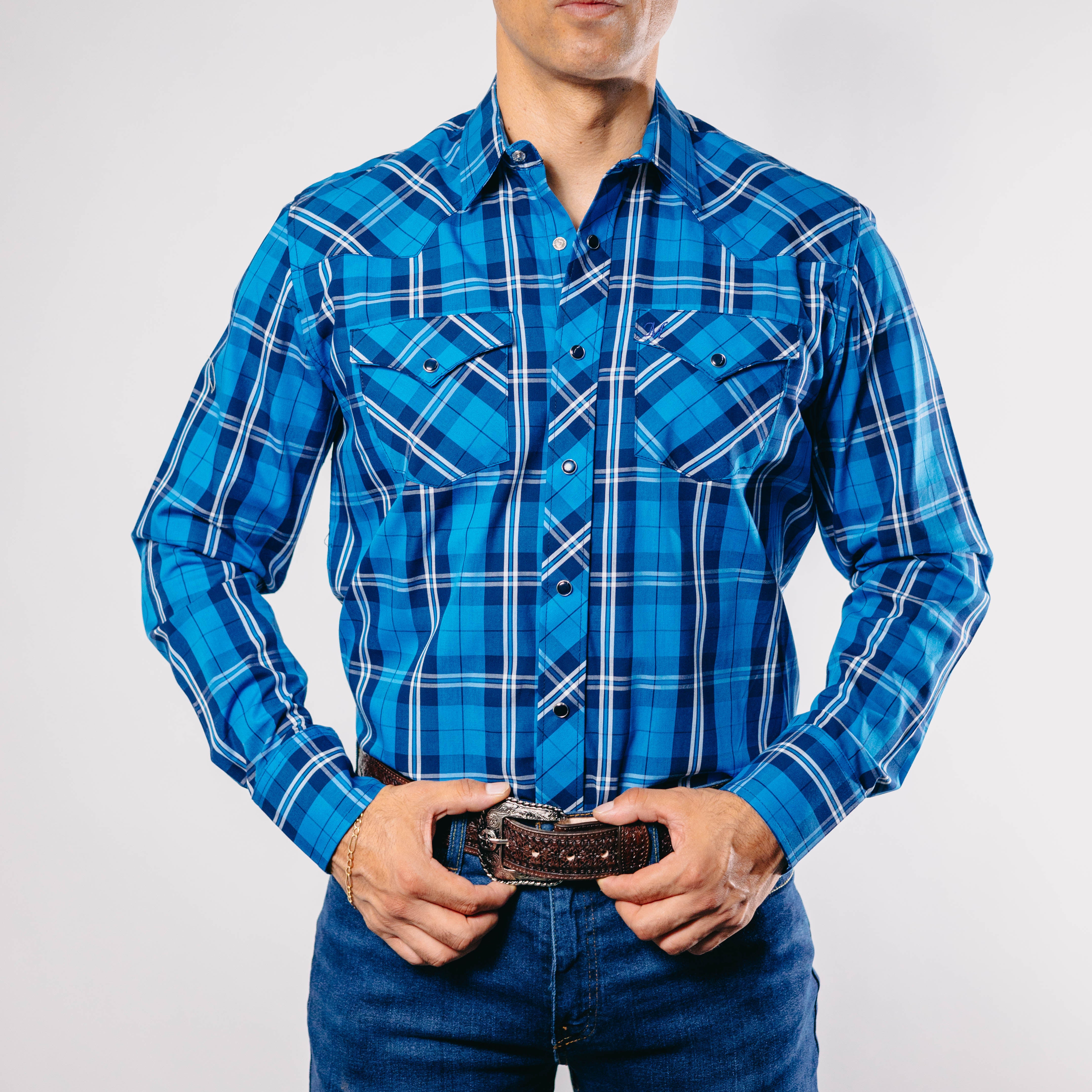 Camisa Vaquera 1800 West, Cuadros Azul, Manga Larga, Broches de presón, 100% Algodón, Corte Regular, SKU# 18W1002, *Modelo Mide 1.80, pecho 1.12 mts y uso talla M