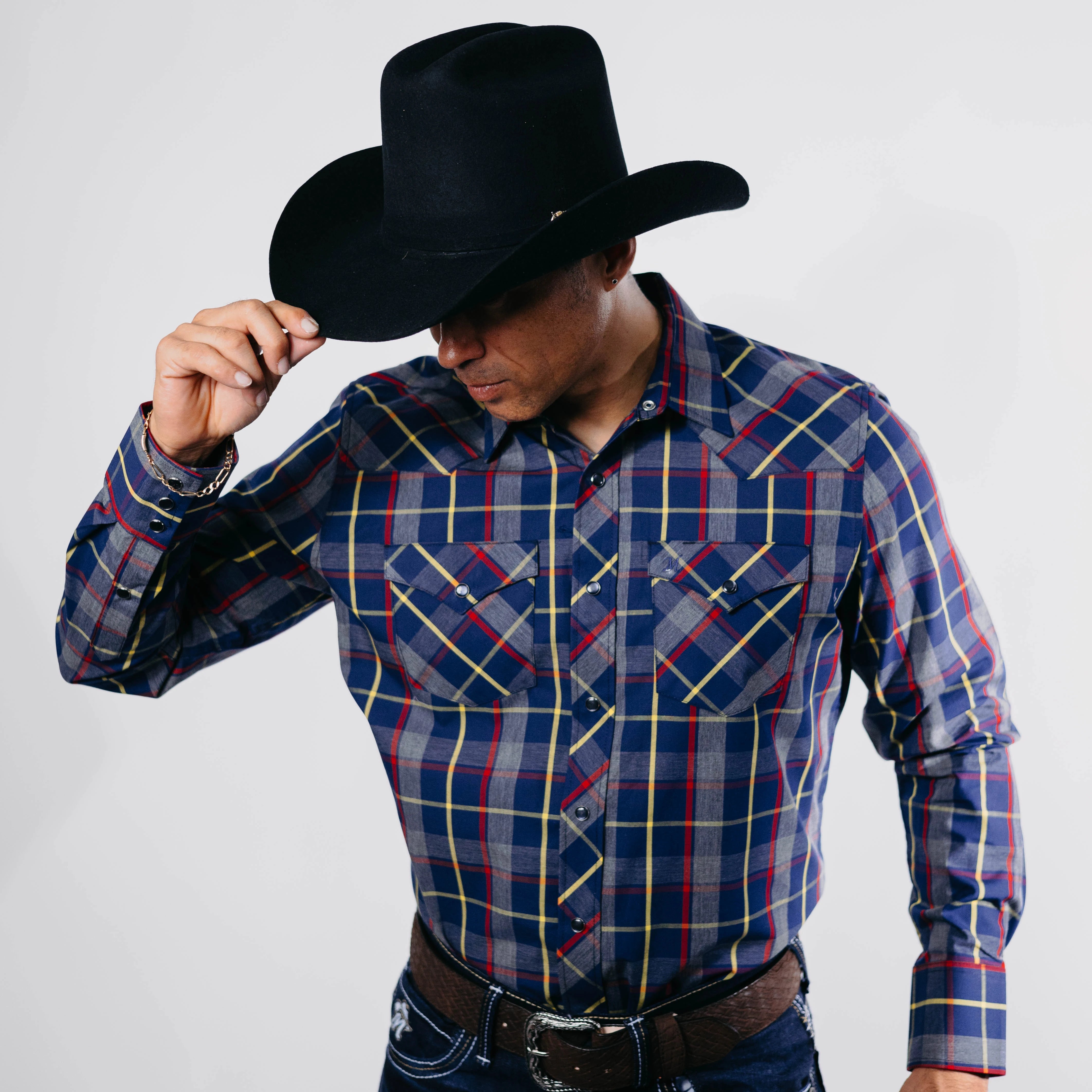 Camisa Vaquera 1800 West, Cuadros, Color Azul/Amarillo/Rojo, Manga Larga, Broches de presión, Material 100% Algodón, Corte Regular, SKU# 18W1013, *Modelo Mide 1.80, pecho 1.12 mts y uso talla M