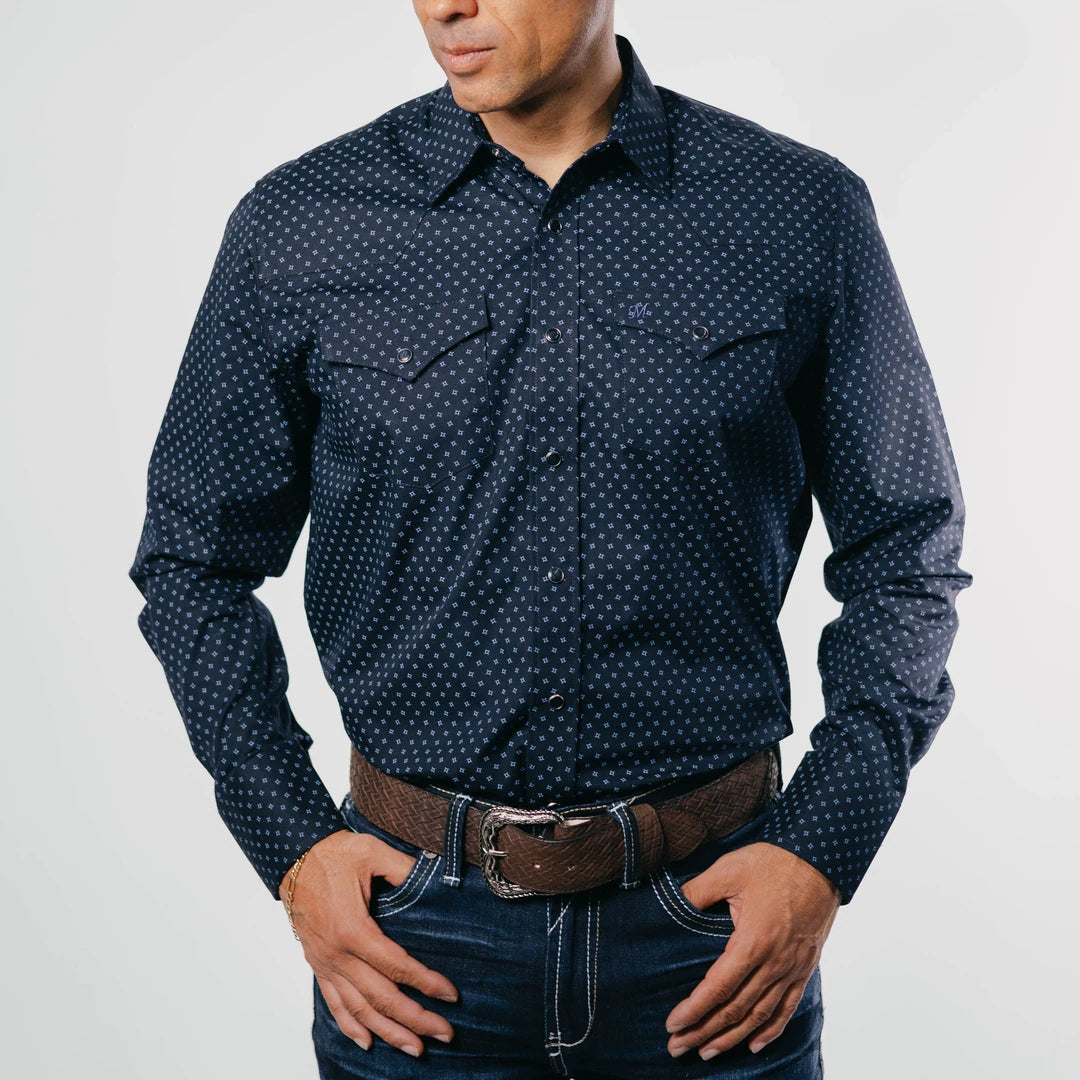 Camisa Vaquera 1800 West, Estampado, Color Azul, Manga Larga, Broches de presiòn, Material 100% Algodón, Corte Regular, SKU# 18W1007, *Modelo Mide 1.80, pecho 1.12 mts y uso talla M
