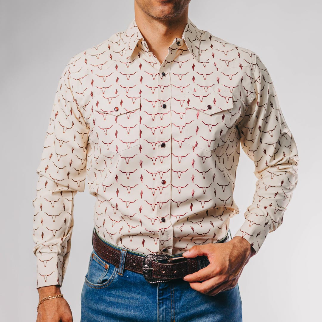 Camisa Vaquera American West, Estampado Longhorn/Cactus, Color Beige/Café, Manga Larga, Broches de presón, Material 65% Poliester y 35% Algodón, Corte Slim, SKU# AMW1026, *Modelo Mide 1.80, pecho 1.12 mts y uso talla M