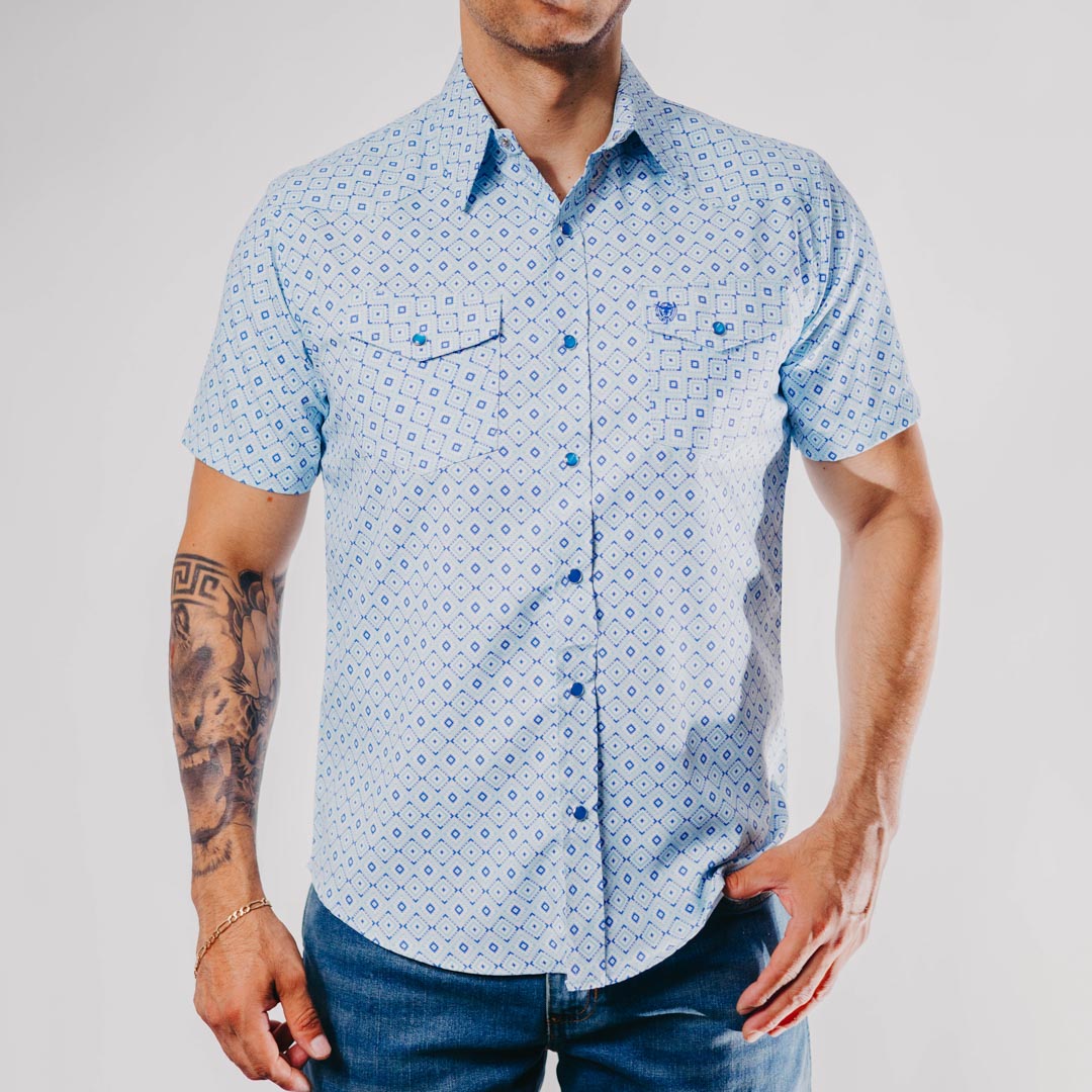 Camisa Vaquera American West, Estampado Azteca, Color Celeste, Manga Corta, Broches de presón, Material 65% Poliester y 35% Algodón, Corte Regular, SKU# AMW1029, *Modelo Mide 1.80, pecho 1.12 mts y uso talla M