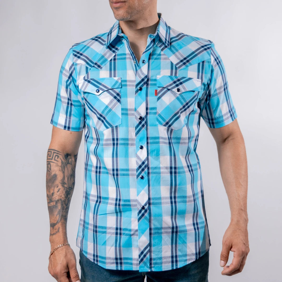 Camisa Bochi Vaquera, Modelo Cuadros, Color Blanco/Celeste, Manga Corta, Broches de presion, Corte Regular, Material 100% Algodón, SKU# BOC1014 *Nota: Modelo Mide 1.80, pecho 1.12 mts y usó talla M