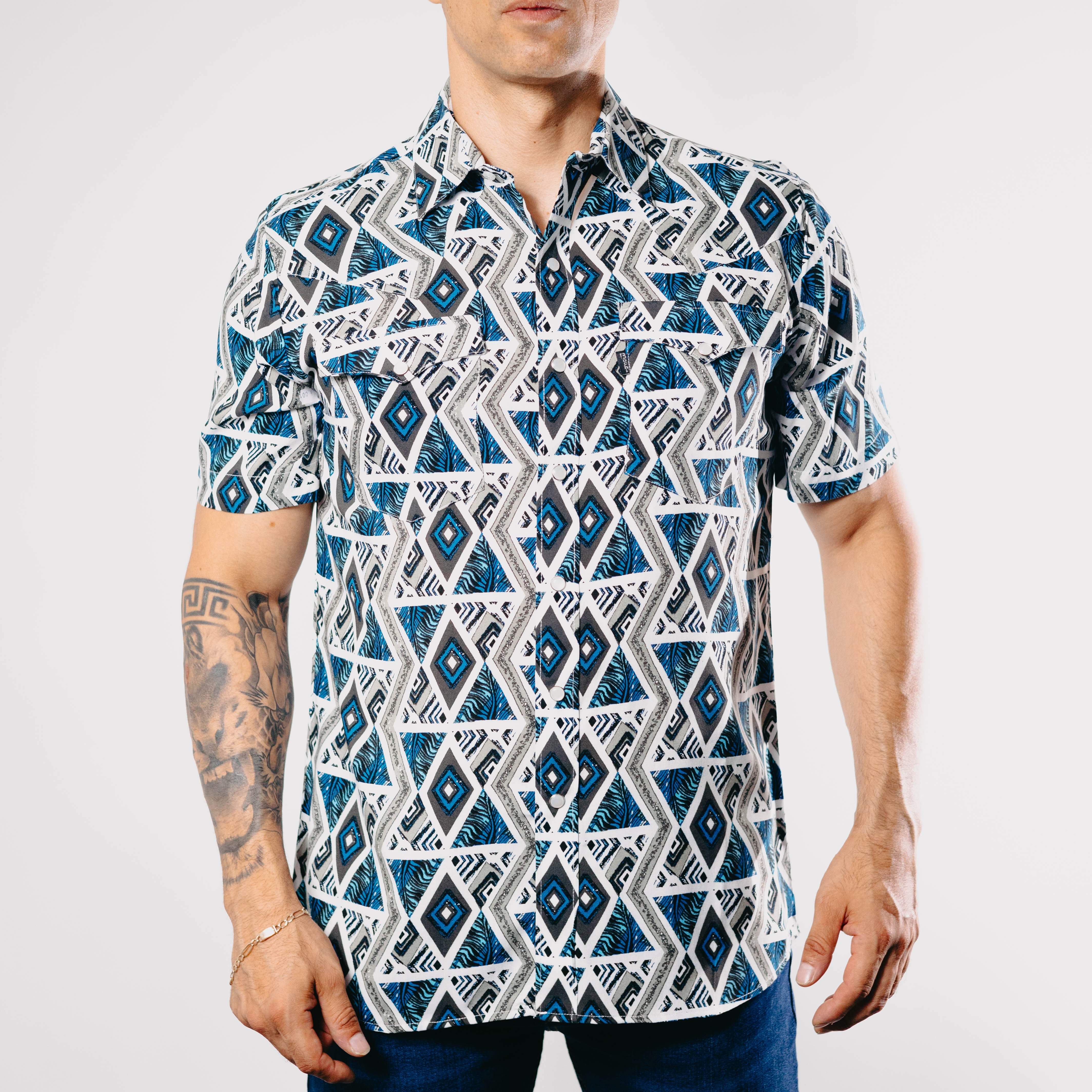 Camisa Vaquera Bochi, Estampado, Gris, Rombos, Manga Corta, Broches de presón, 100% Viscosa, Corte Regular, SKU# BOC1013, *Modelo Mide 1.80, pecho 1.12 mts y uso talla M