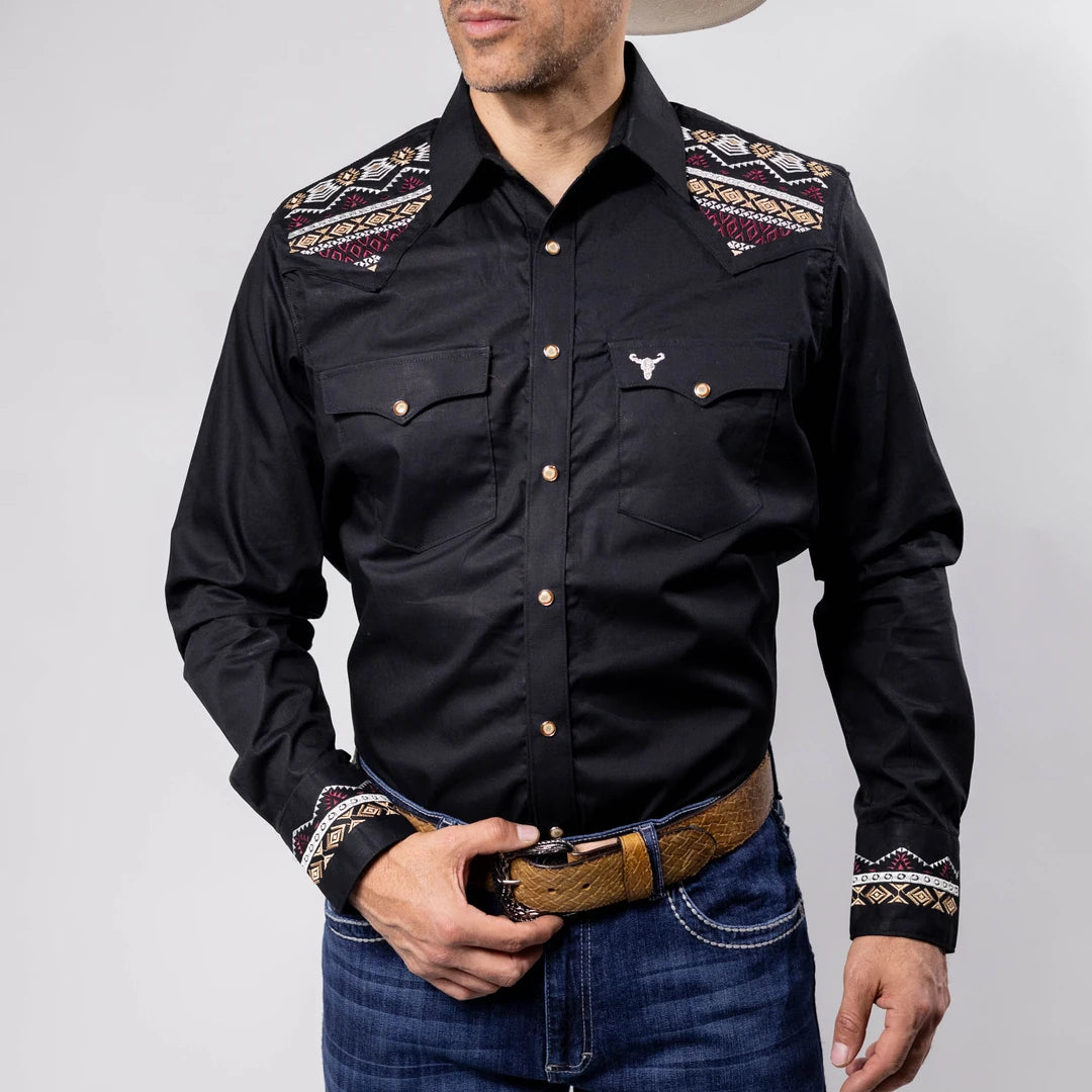 Camisa Cactus, Bordada, Color Negro, Manga Larga, Broches de presion, Material 100% Algodón, Corte Regular, SKU# CAC1126 *Modelo Mide 1.80, pecho 1.12 mts y uso talla M