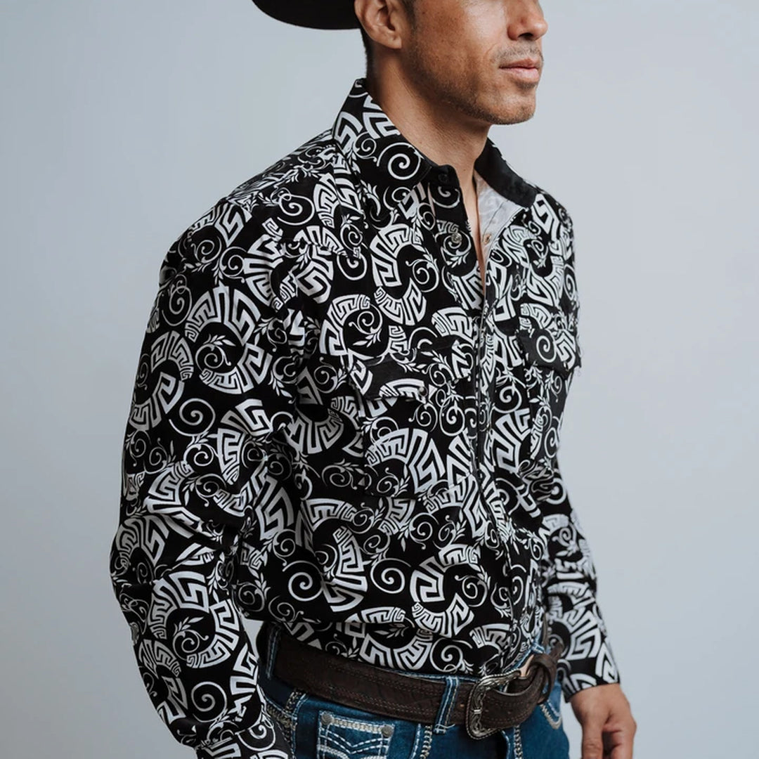Camisa Cactus, Estampado Flock, Color Blanco/Negro, Manga Larga, Broches de presion, Materiales 60% Poliester, 37% Nylon y 3% Spandex, Corte Regular, SKU# CAC1113 *Modelo Mide 1.80 y uso talla M